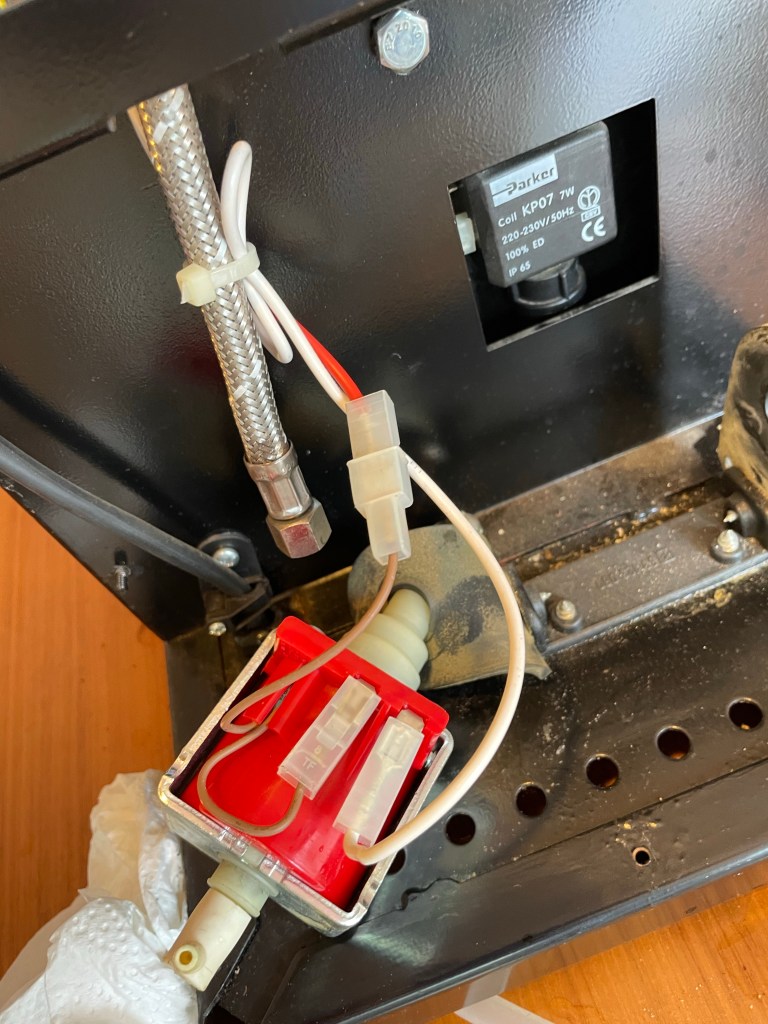 The pump lies in the rubber frame, remove the right hand side clip and disconnect the tube. To remove the metal hose you will need two spanners. I gave the whole interior a good clean after fitting the new pump. The replacement pump is an Ulka EX5, I got mine from theespressoshop in Glasgow, along with a bunch of other spares, I’d recommend them.