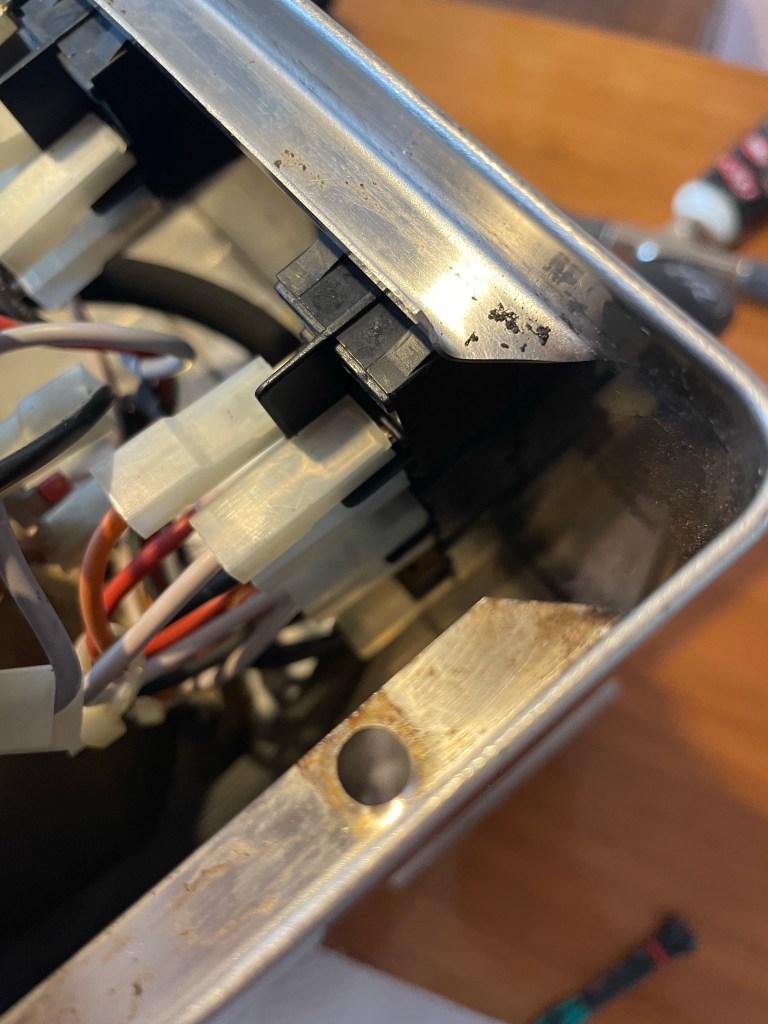 Once you’ve got the top off there are two screws which hold the rear frame onto the front of the machine. These are horizontal to the base of the machine and you can see the screw holes on each side at the top. there is then one more screw at the bottom at the back, in the middle of the shot above. This was quite stiff to remove on my machine, as it had got gunged up with coffee.