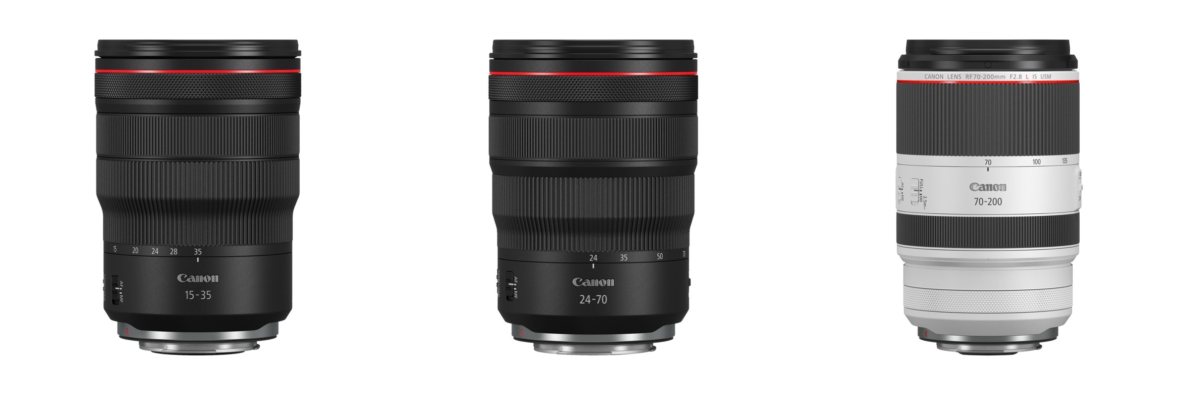 These are the pro-level ultra-wide zoom, the normal zoom and a telephoto zoom. The exact focal lengths are 15-35 mm; 24-70 mm; and 70-200 mm.